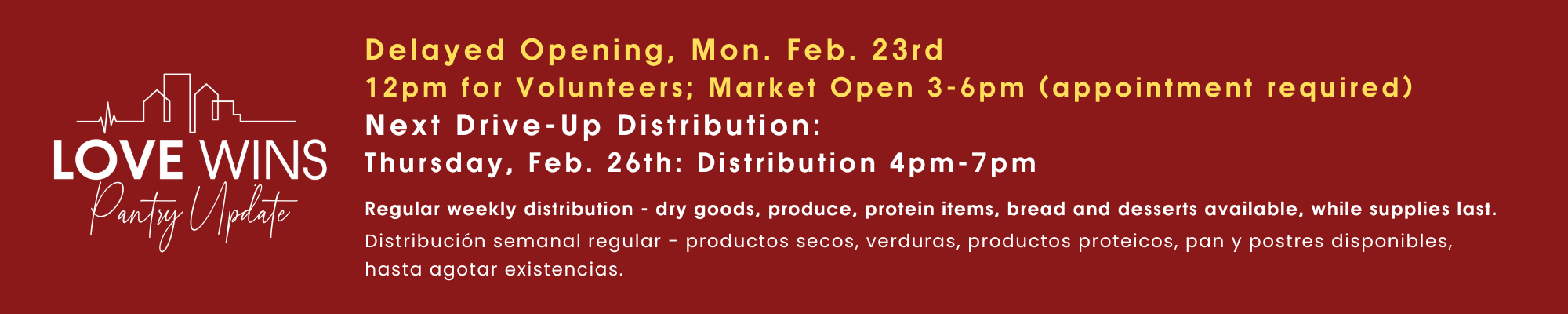 The Love Wins Pantry exists to support individuals in our local community experiencing food insecurity - our goal is always to far exceed just meeting the immediate need - it extends to passionately communicate, to those we serve and those who serve with us, that they are LOVED beyond measure!